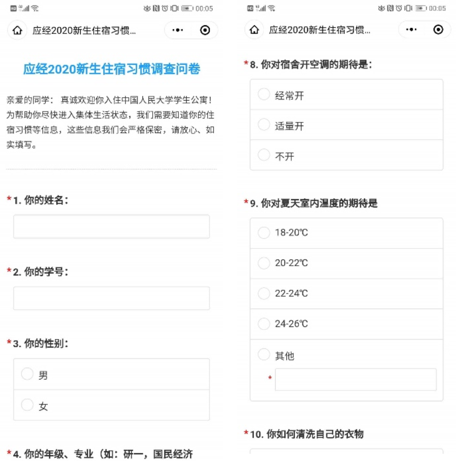 宿舍是新生生活的最小单元。在公司住宿调查的基础上,公司精心制作了包含14个问题的调查问卷,涉及基础信息、睡眠习惯、特殊偏好、寝室定位、人际期待等内容,全方位了解同学们的个性化需求,力求为同学们绘制精准住宿自画像。根据新生调查结果分配宿舍和床位,获得员工和家长的认可和赞许。