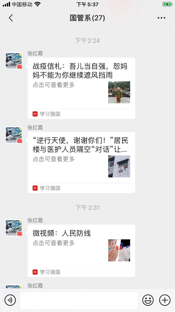 大家在活动中学习了因战“疫”而牺牲在一线的优秀共产党员的事迹,支部成员线下也自行通过新闻媒体平台了解相关事迹并总结了感想。2月24日下午至2月25日下午,党员同志们在支部微信群里积极参与讨论,真挚地表达了对抗疫一线英雄们的敬意,并表明了向他们学习、弘扬其无私奉献精神的决心。通过此次主题党日活动,使大家更加深切地感受到了榜样的力量,增强了作为一名共产党员的责任感与使命感,明确了自己努力的方向。