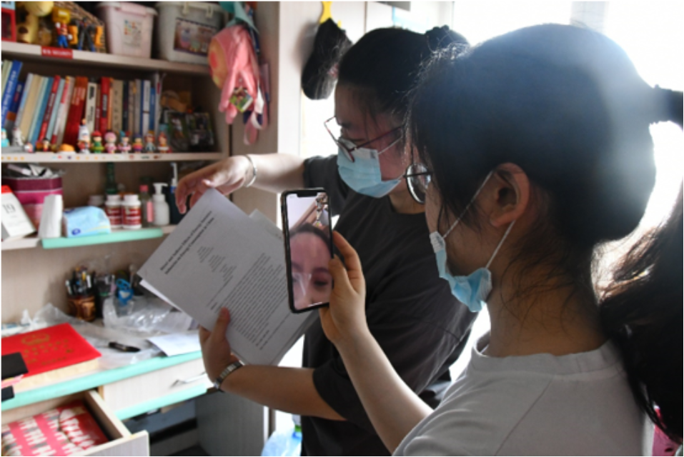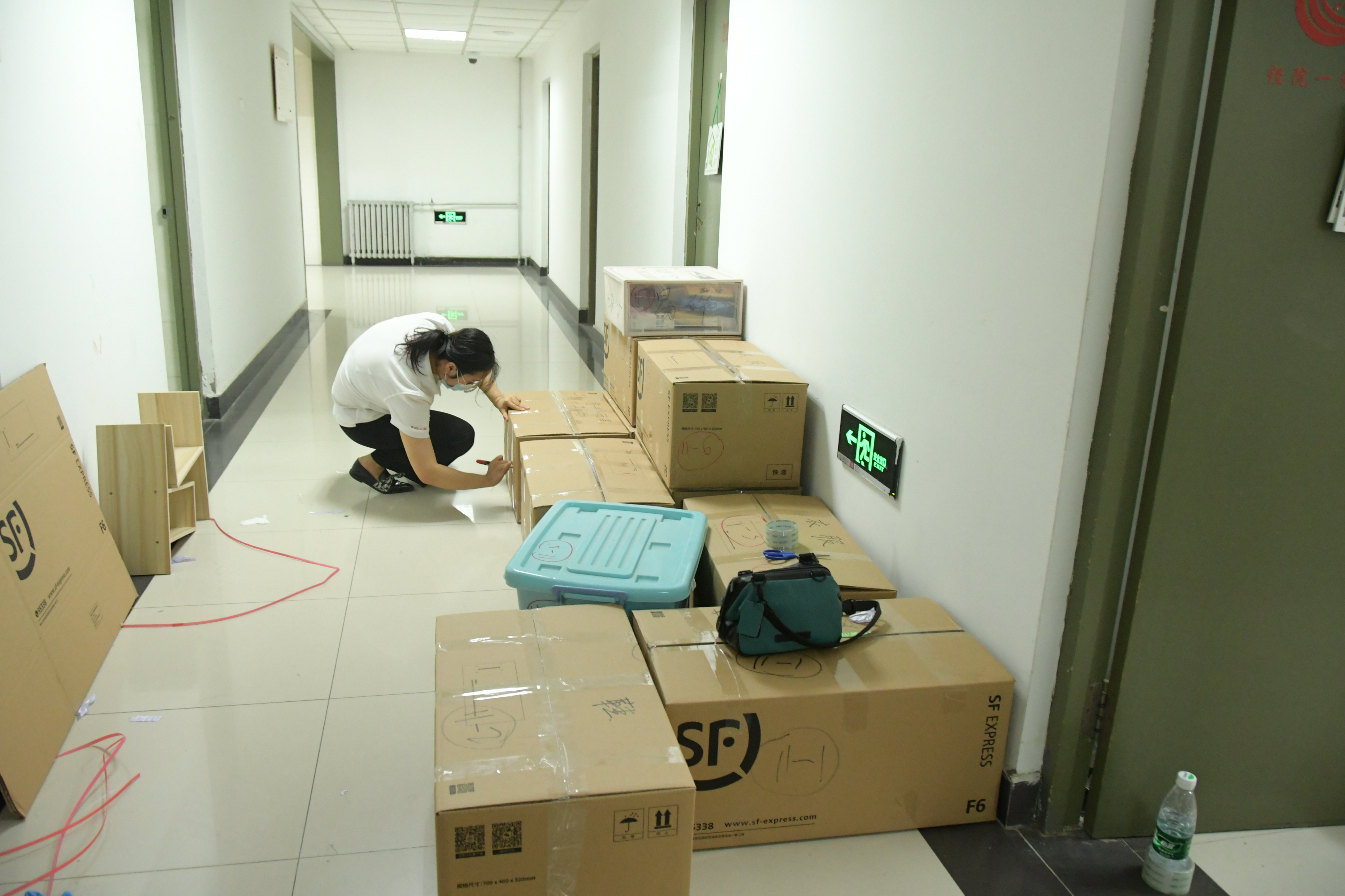 这样的对话重复着一遍又一遍。师生志愿小队一会整理着东西,一会又穿梭于走廊不停地搬运行李。夏天佩戴起口罩更加闷热,但他们也顾不上这些了——整理、打包好一位员工的包裹之后,又开始和另一位员工视频连线、整理物品、打包……