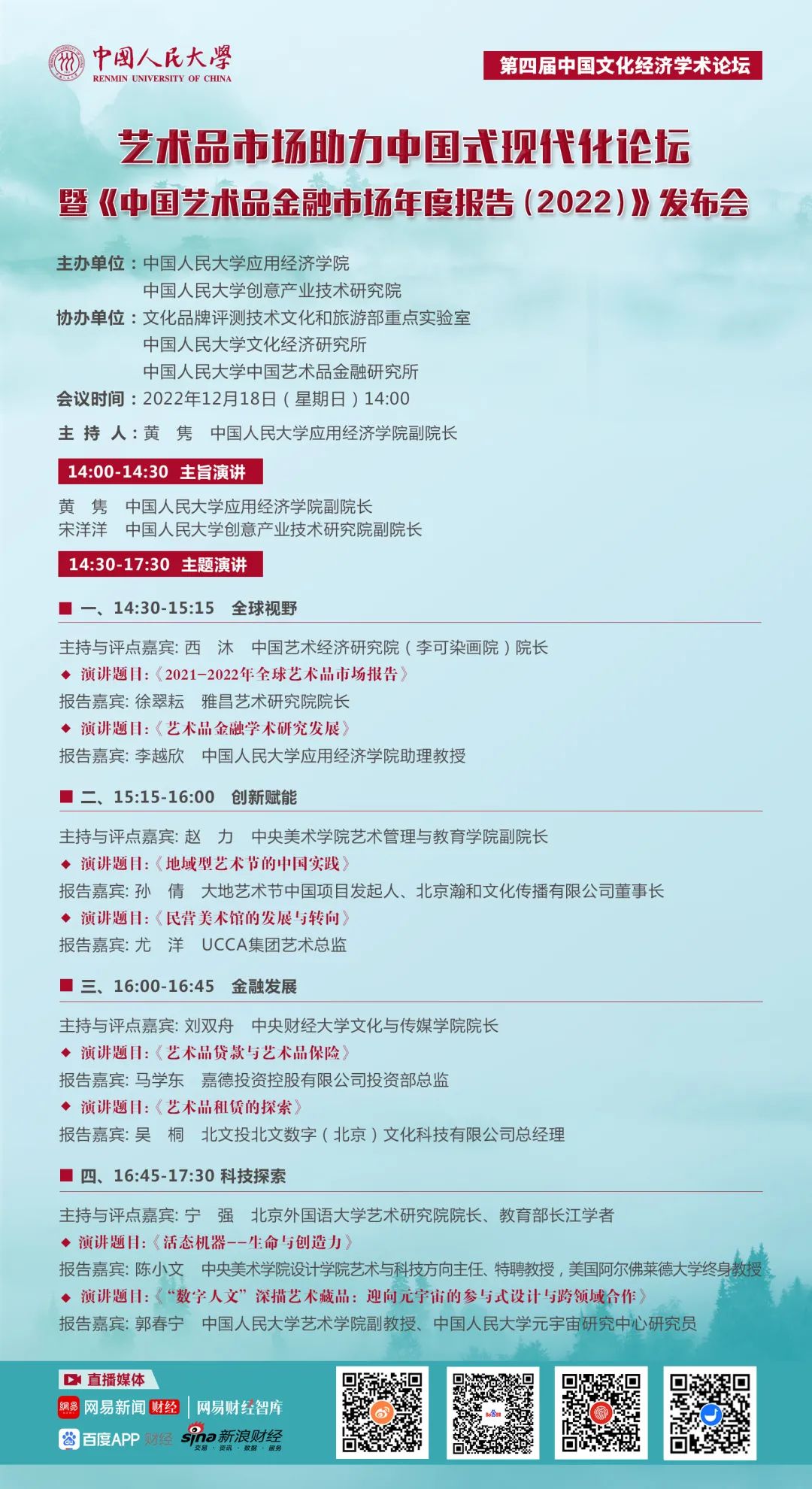 中国艺术品市场在提升社会文明素养、传承中华传统文化、传播文化软实力、促进产业升级等方面发挥着重要作用。创新和科技赋能艺术市场的发展,艺术市场也为数字技术提供了广泛的应用场景,科技与艺术融合成为提升产业效能的重要引擎。在此背景下,英国威廉集团官网和英国威廉集团官网创意产业技术研究院定于2022年12月18日下午共同主办第四届中国文化经济学术论坛--艺术品市场助力中国式现代化论坛暨《中国艺术品金融市场年度报告(2022)》发布,邀请高校学者和业界专家围绕艺术品市场“创新、科技与未来”深入研讨,助力中国式现代化建设。诚邀您线上参与。