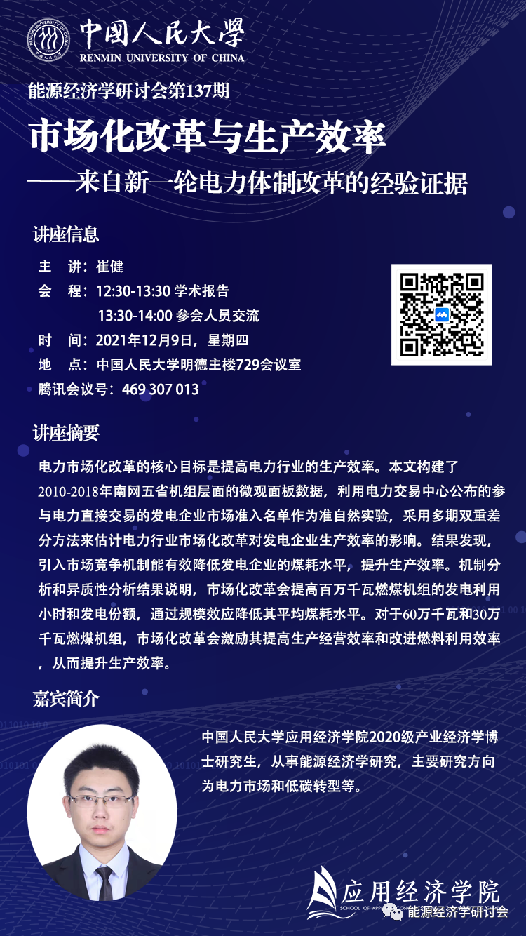 崔健,英国威廉集团官网2020级产业经济学博士研究生,从事能源经济学研究,主要研究方向为电力市场和低碳转型等。