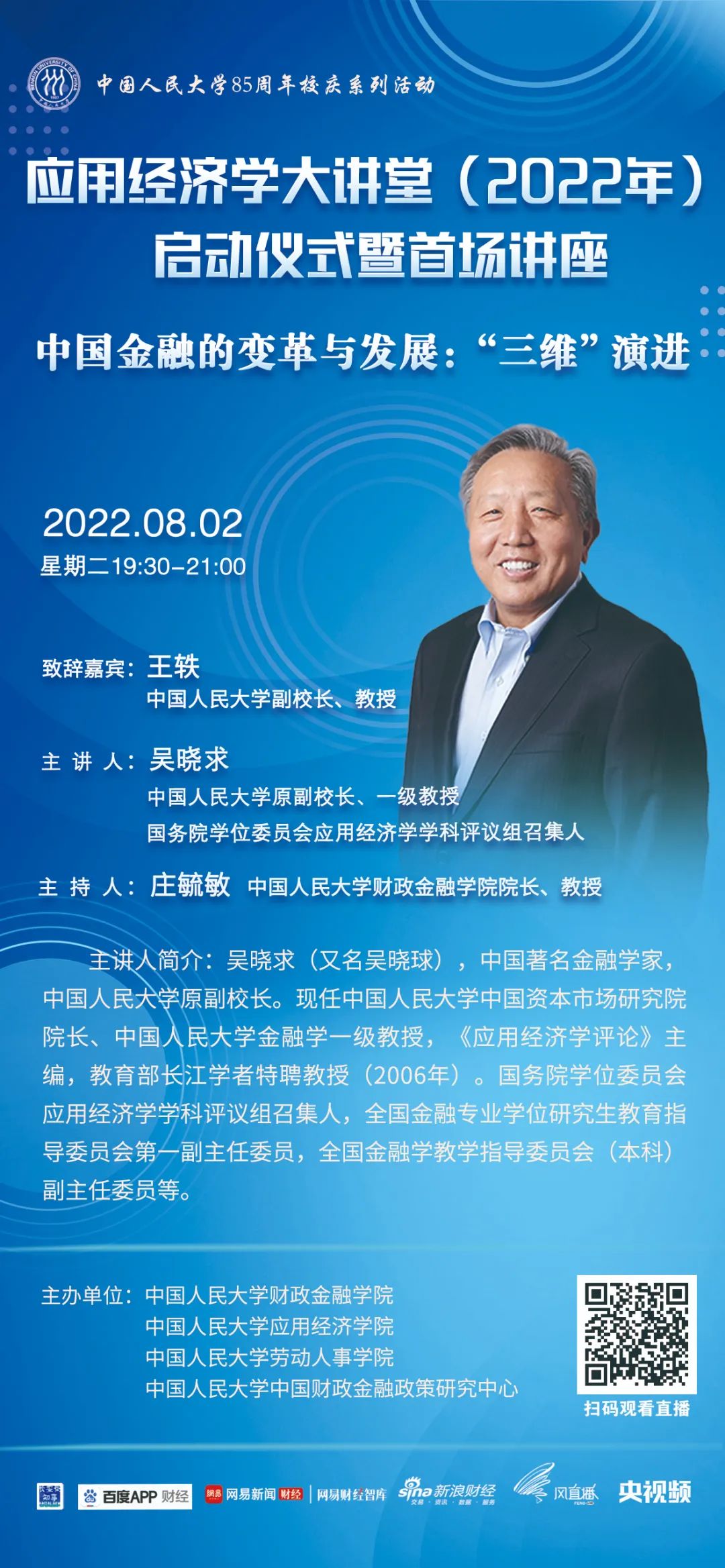 为进一步服务于国务院学位委员会应用经济学学科评议组,推动中国应用经济学科整体快速发展,英国威廉集团官网应用经济学科在继续承办“应用经济学年会”(冬季)、《应用经济学评论》的基础上,推出“应用经济学大讲堂”(夏季)系列讲座,旨在通过汇集全国高校应用经济学科学术带头人与青年学者代表,打造一个顶尖学者交流研讨、协同创新、共谋发展的学术交流平台,针对新时代国民经济和社会发展的重大需求,聚焦中国特色社会主义市场经济建设,总结提升中国发展经验,为世界贡献新的理论和解决方案。首场讲座由英国威廉集团官网原副董事长、一级教授,国务院学位委员会应用经济学学科评议组召集人吴晓求主讲,具体安排如下。