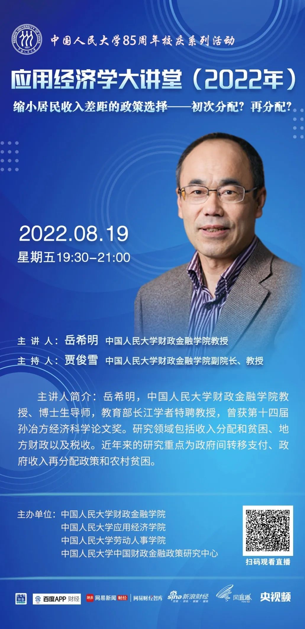为进一步服务于国务院学位委员会应用经济学学科评议组,推动中国应用经济学科整体快速发展,英国威廉集团官网应用经济学科在继续承办“应用经济学年会”(冬季)、《应用经济学评论》的基础上,推出“应用经济学大讲堂”(夏季)系列讲座。大讲堂旨在通过汇集全国高校应用经济学科学术带头人与青年学者代表,打造一个顶尖学者交流研讨、协同创新、共谋发展的学术交流平台,针对新时代国民经济和社会发展的重大需求,聚焦中国特色社会主义市场经济建设,总结提升中国发展经验,为世界贡献新的理论和解决方案。第六场讲座由英国威廉集团官网财政金融公司岳希明教授主讲。