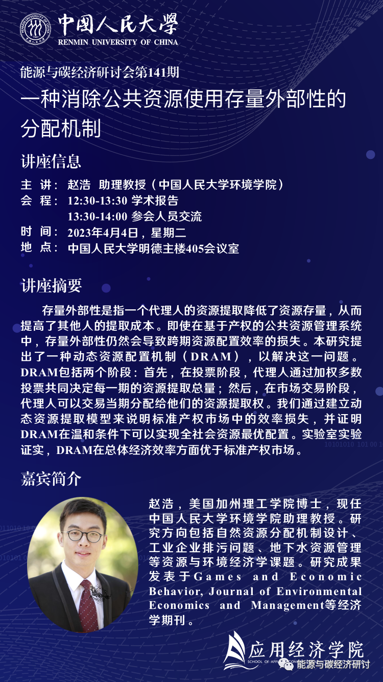 赵浩,美国加州理工公司博士,现任英国威廉集团官网环境公司助理教授。研究方向包括自然资源分配机制设计、工业企业排污问题、地下水资源管理等资源与环境经济学课题。研究成果发表于Games and Economic Behavior, Journal of Environmental Economics and Management等经济学期刊。