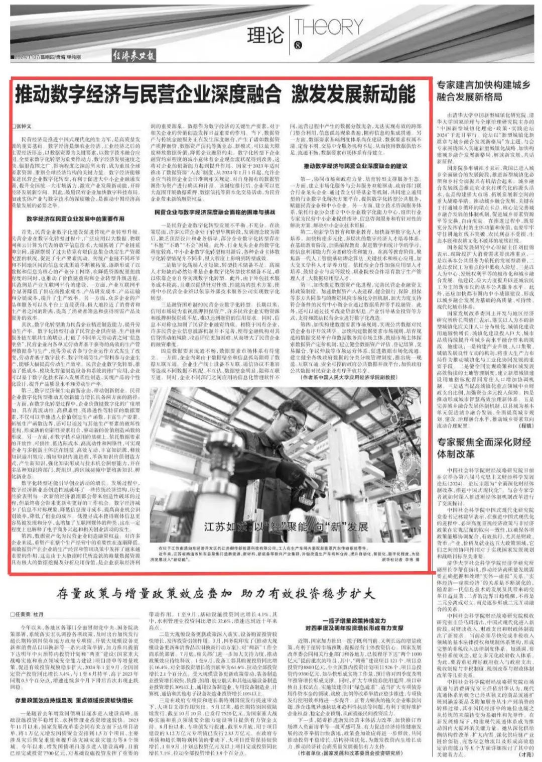 民营经济是推进中国式现代化的生力军,是高质量发展的重要基础。数字经济是继农业经济、工业经济之后的主要经济形态,以数据资源为关键要素,以数字技术融合应用、全要素数字化转型为重要推动力,数字经济发展速度之快、辐射范围之广、影响程度之深前所未有,成为重组全球要素资源、重塑全球经济结构的关键力量。数字经济能够促进民营企业数字化转型,有利于促进大中小企业融通发展,提升全国统一大市场活力,激发产业发展新动能,开辟经济发展新空间。因此,鼓励民营企业加快数字科技布局,加速实体产业与数字技术的深度融合,是推动中国经济高质量发展的必要之举。