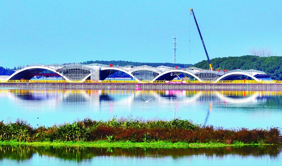 作为长三角示范区一体化审批的首个跨域交通项目,水乡客厅东西向主干道浦港路东延工程西起吴江区思古甸港,东至青浦区沪青平公路。其中的雪落漾桥位于上海、江苏交界处,主桥跨径280米。