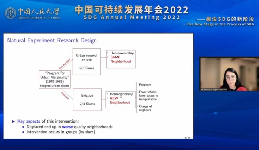 哈佛大学的博士后Fernanda Rojas-Ampuero作报告,题目为“Sent Away: The Long-Term Effects of Slum Clearance on Children”。报告聚焦智利在1979-1985年的贫民窟安置计划。该计划使得一部分贫民窟居民被迫搬迁到位于城市边缘的贫困地区,另一些则在原来地点新建住房。通过追踪并比较搬迁与未搬迁家庭的儿童在四十年后的收入和教育情况,该研究发现,搬迁家庭的儿童成年后的收入和教育水平均低于未搬迁家庭的儿童。该研究进而从安置地的环境条件对搬迁的负向影响做出解释,包括安置地的公司数量更少、社区更加分散程度、距离地铁更远等因素。