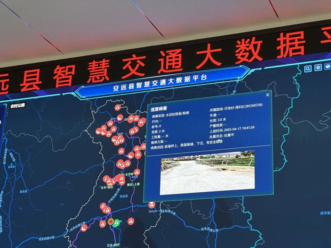 公路养护板块面向养护中心、乡镇以及养护公司管理操作,通过“APP+PC +大屏”三端使用方式,采用信息化手段对国省干线路网、农村公路数据及公路交通安全设施、管理设施、服务设施、桥隧涵构造物等资产进行采集,并将采集数据纳入统一平台进行管理,实现农村公路智慧化管养。县交通运输局养护中心联合各乡镇路长、村干部开展常态化道路巡查打卡,发现问题后通过APP即时上报,后台根据问题性质分类处理。若涉及市场化养护路段,则由平台自动派单至养护公司,养护完成后需上传照片销号备案,确保“事事有回应,件件有闭环”。