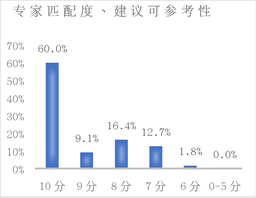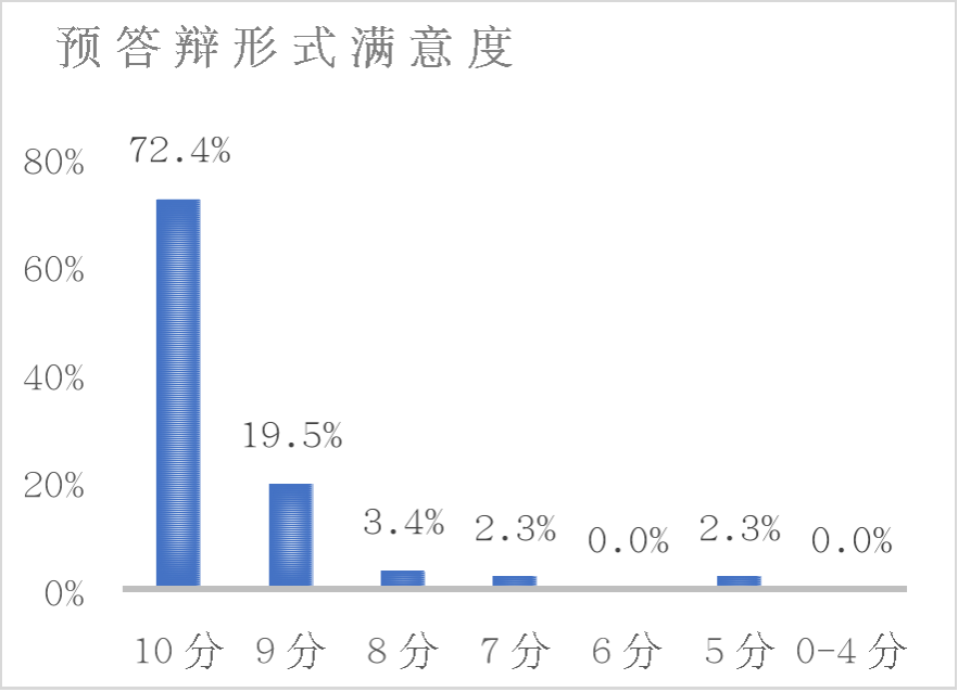 通过对问卷结果进行分析,在有效回收的90份问卷中,在10分制满分的情况下,对预答辩组织形式满意度的平均分为9.57分,对专家匹配度和建议可参考性的满意度的平均分为9.21分,对此次参加预答辩硕士研究生学术水平符合硕士毕业生学术要求的满意度平均分为8.65分。