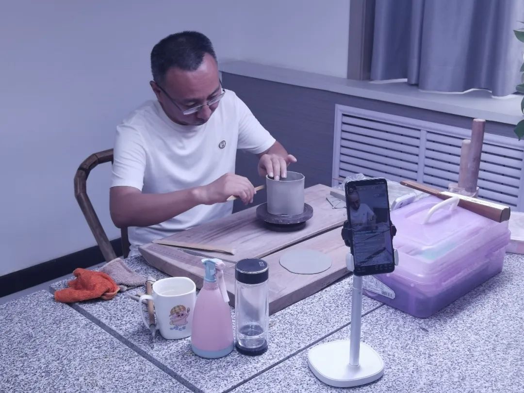 ▲延长县中超利永紫砂乡村振兴工场工人在直播制壶