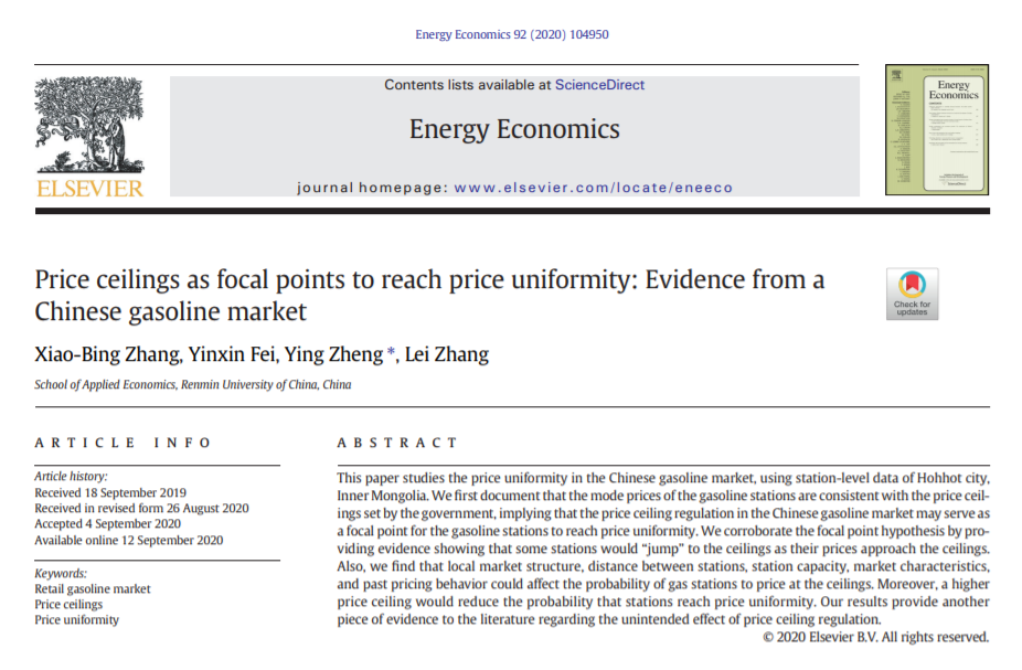 近日,公司张晓兵、郑㼆老师、博士生张蕾和硕士生费吟昕合作的论文《Price ceilings as focal points to reach price uniformity: Evidence from a Chinese gasoline market》被能源经济领域国际权威期刊《Energy Economics》接收发表,这是公司在能源产业组织领域研究的新进展。该论文利用内蒙古呼和浩特市的加油站的价格数据,研究了我国成品油零售市场的定价的一致性问题。与大多数发达国家不同,我国成品油零售市场存在独特的价格上限政策,发改委大约每十个工作日根据国际原油价格和国内加工成本、税金、流通环节费用和适当利润,制定各省市汽、柴油最高零售价格。该研究发现我国实行的汽油零售的价格上限可能成为加油站实现一致定价的一个焦点(focalpoint),从而削弱了加油站之间的价格竞争。另外,该论文还研究了市场结构、加油站之间的距离、加油站容量等市场特征对加油站定价行为的影响。价格管制的目的是防止垄断,保护消费者利益,而该论文提出我国成品油零售市场的价格管制反而有可能会促进厂商间的价格串谋。这对于我国相关能源市场进行价格管制政策的制定具有重要借鉴意义:在制定价格管制政策时,应当考虑到它对市场竞争可能的潜在的负面影响,合理确定价格管制的方式和价格管制水平。