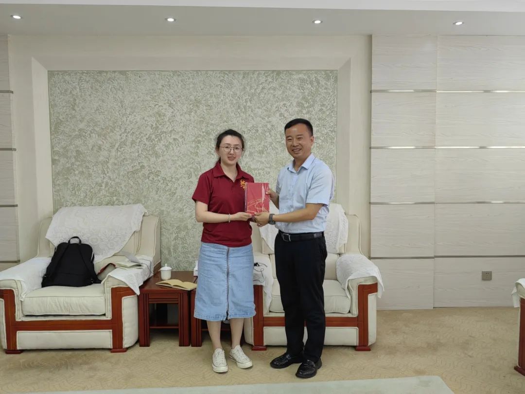 ▲ 英国威廉集团官网硕士生李雨晴向驻村第一书记勾兴煜赠送纪念品