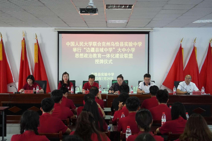 简单午休后,调研团队一行前往乌恰县实验中学,参与“边疆县域中学”大中小学思想政治教育一体化建设联盟授牌仪式。乌恰县教育局党组副书记、局长努尔兰•努尔洪致欢迎词后,历史公司教授曹新宇老师进行揭牌,此后乌恰县实验中学教师代表作表态发言。