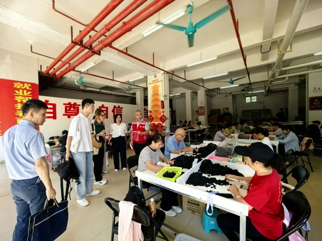 令调研团印象深刻的,是一条街上的核心单位:残疾人辅助性就业基地。车间中,三十多位残疾人,热火朝天地从事自身擅长的工作。黄文秀、张海迪等人的优秀事迹画报挂在墙上,激励着辛勤劳作的人们。据了解,这个车间日常有50多名残疾人流动工作,根据沿海发达地区的标准收获计件工资。弱势群体,在帮扶车间激发着强劲的奋斗动能。调研团看到,一位腿脚残疾的阿姨在行云流水地操作手工。据介绍,尽管阿姨的家庭条件比较困难,她依旧如天等山间的翠竹般,坚韧地撑起两位儿子进入大学就读。她身残志坚,用实际行动证明自己的人生价值,也将奋斗的火种传递给下一代。“扶贫先扶志”的理念在残疾人就业基地中得到生动诠释。
