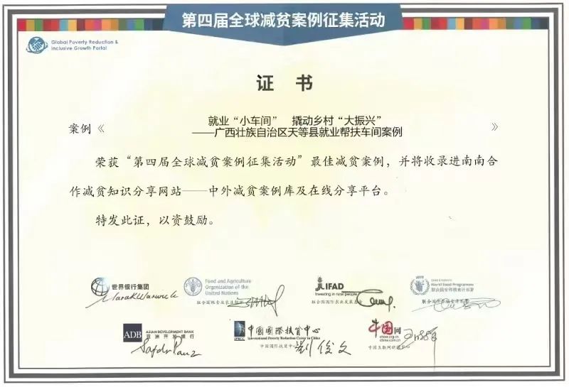 ▲就业帮扶车间获全球最佳减贫案例证书