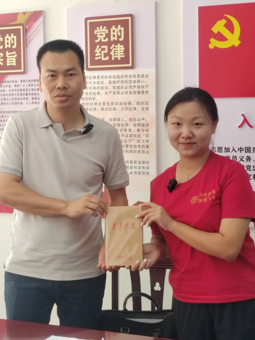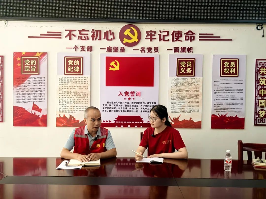 ▲本科生尹歆雅访谈天等镇龙岩社区驻村第一书记陈新