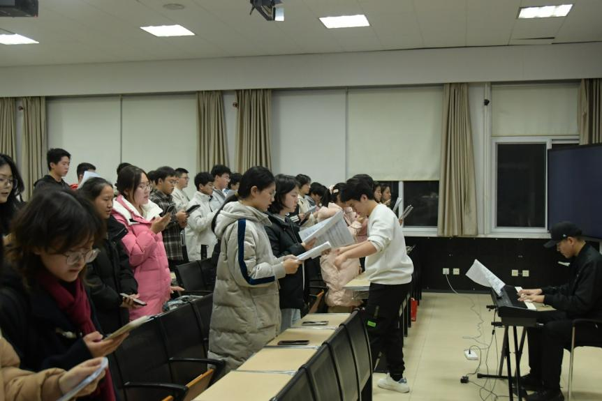 在过去的一个多月里,同学们积极参加排练,以饱满的热情备战演出。从深秋到初冬,展演队员们在每一次训练中用心打磨,精益求精。在王程老师和王振宁师兄的悉心帮助下,同学们逐渐掌握了发声技巧与乐理知识,用歌声演绎团队协作的力量。大家在各个声部长的带领下一步步学习歌曲,也增进了彼此的感情。
