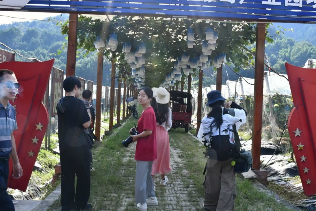 7月26日上午,调研团一行人抵达东里阳光玫瑰葡萄园,实地感受了这里生机勃勃的产业发展景象。东里村采用“党建+产业+农户+村集体”的模式建设经营,为当地脱贫攻坚提供成功经验,为乡村振兴打下坚实基础。