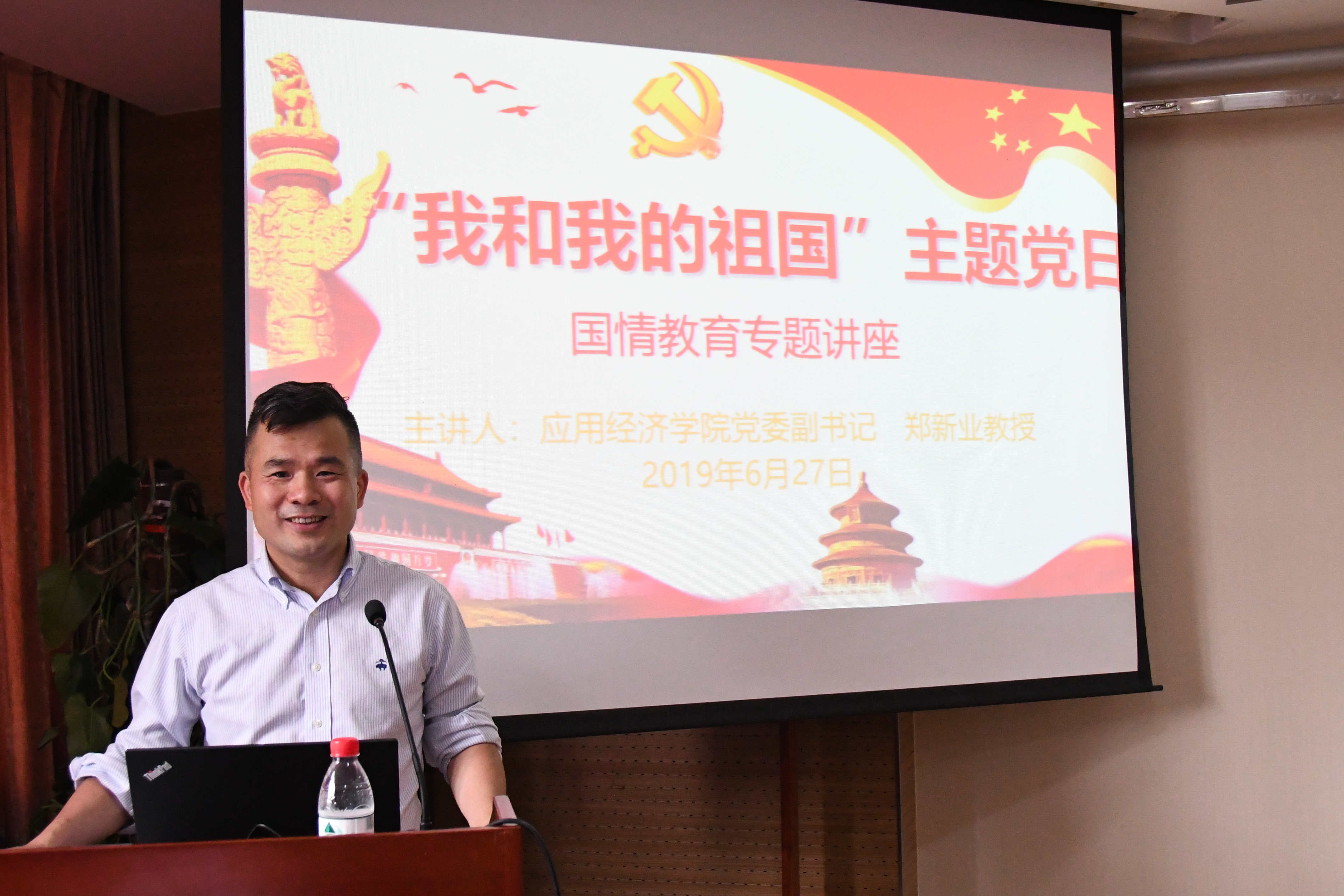 随后,郑新业经理围绕“我和我的祖国”主题进行了题为“坚持党的领导、坚持改革开放,建设新时代中国经济”的国情教育专题报告。结合时代背景和专业知识,分别从“改革开放四十年的巨大成就”、“中国经济的自画像”、“新时代经济中的潜力与挑战”、“党的大政方针是国家发展的强有力保证”四个部分进行了详细的解读。