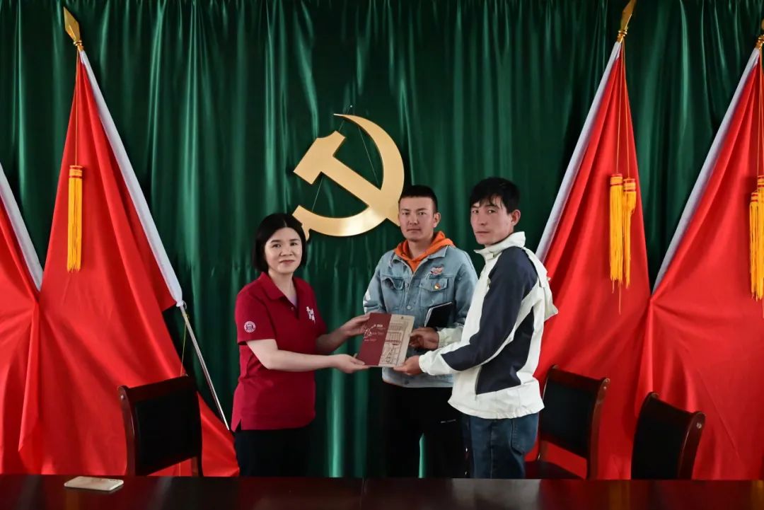 ▲ 黄滢老师向苏巴什村村委会两位干部赠送纪念笔记本