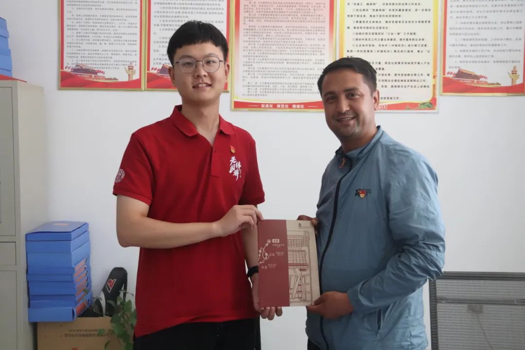 ▲ 硕士研究生杨璨瑜向买买提努尔•吾布力赠送纪念本