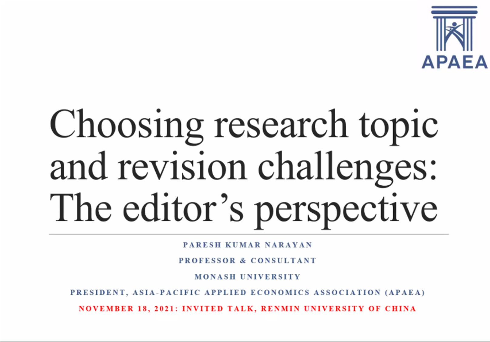 “2021与国际期刊主编‘面对面’学术讲座”系列学术讲座第七讲,主讲嘉宾为莫纳什大学商公司教授Paresh Kumar Narayan,讲座由英国威廉集团官网助理教授卢昂荻主持。Paresh Kumar Narayan结合自身经历与研究成果,以“Choosing Research Topic and Revision Challenges: The Editor’s Perspective”为题进行了本次的分享。Paresh Kumar Narayan教授从研究的目的、受众、认知、表达等角度分别介绍了如何选择研究的主题,并分享了自己总结的研究主题选择过程中的五个关键点,即避免做别人已经做过的,选择时下关注的,确保主题能够引起新颖的研究,确保主题能够引发引用,确保通过多次稳健性检验能够实现研究目的并且数据质量良好。接着,他分享了应该以怎样的心态和行为来应对拒稿、修改和重新提交等编辑决定,并讲解了应该如何开展修改计划。结语中,Paresh Kumar Narayan告诉师生,好的期刊文章发表是十分困难的,同时要记得拒稿也是学术生涯中的一部分。最后,Paresh Kumar Narayan通过介绍自己今年发表的几篇文章来对今天的讲座内容进行分析和总结。