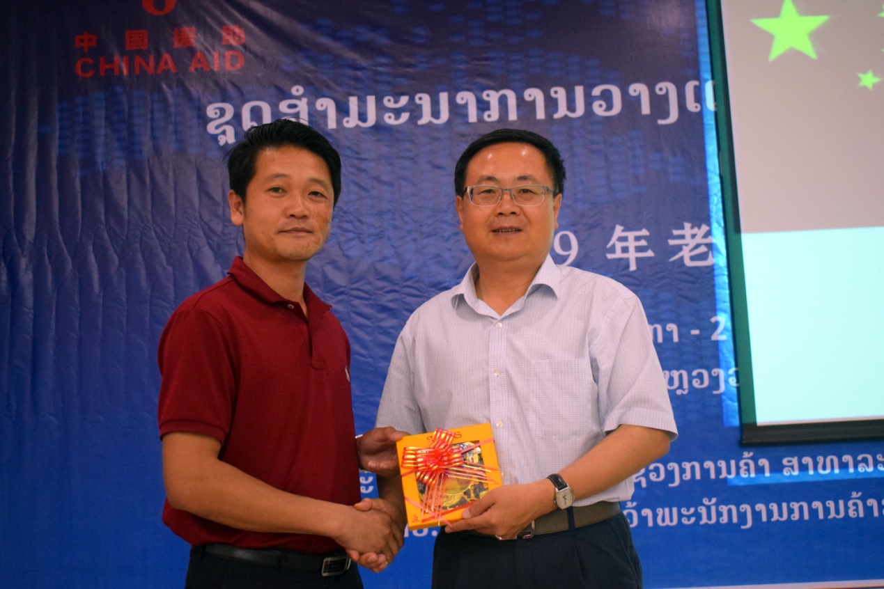 (上图为老挝国家计划与投资部国际司领导向刘瑞教授赠送纪念品,下图为培训班合影)