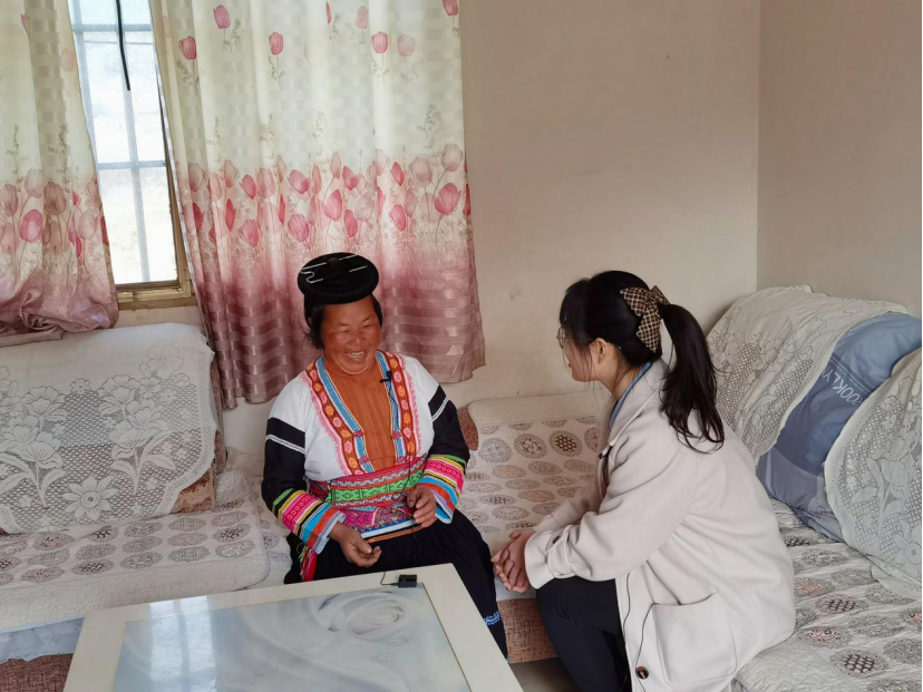 ▲在云南省寻甸县,本科生陈梦婷听小海新村脱贫户苏秀兰奶奶讲带头号召村民易地搬迁的故事