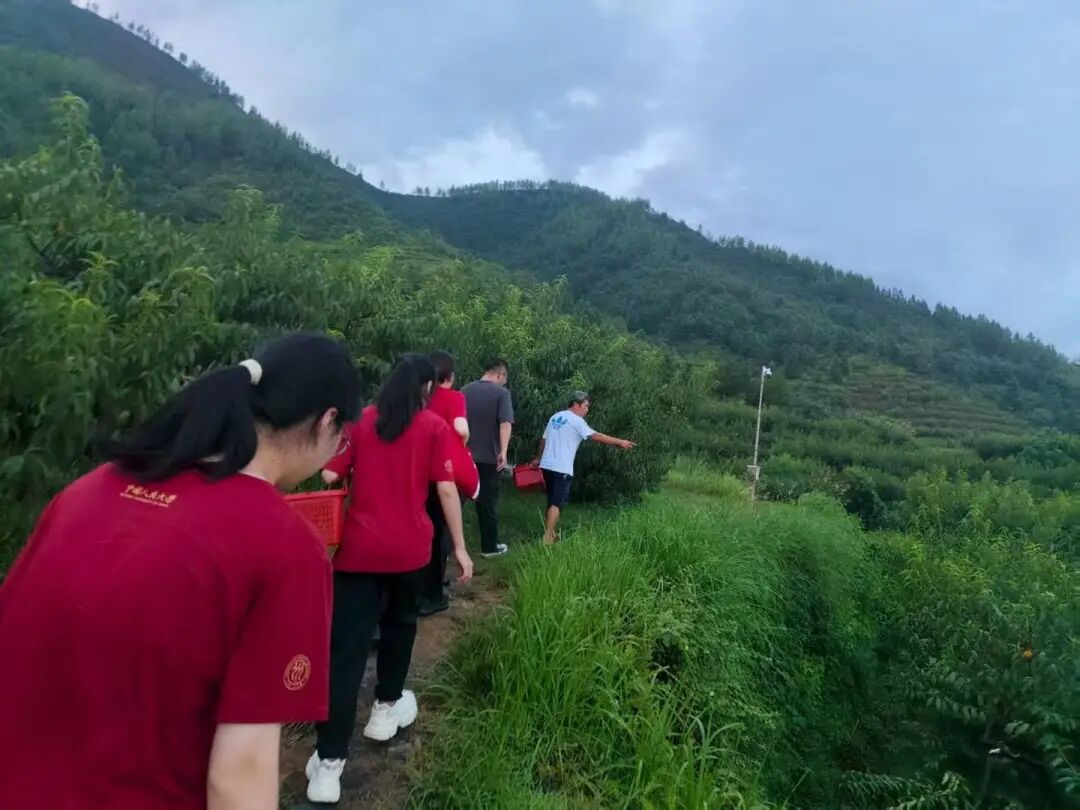 8月5日傍晚,访谈团前往龙门畈乡钱家村黄桃基地调研。该基地采用自产自销模式,所产黄桃新鲜脆甜,但受限于不便长途运输,客户多为上饶市及横峰县内居民,以自驾入园采摘为主。在种植环节目,为防病虫害与外力损伤,需给未成熟黄桃套袋,务工人员均为周边居民,按件计酬(套袋0.06元/个),手脚麻利者日收入可达300余元;黄桃成熟后,基地再聘请工人挑选采摘品相佳的果实,为当地提供了不少就业机会。基地黄桃树种植密度为每亩35棵,总计超7000棵,鲜果售价10元/斤,自助采摘15元/斤。目前,因基地未配套建设加工厂房,每年都有大量新鲜黄桃因无法及时处理而浪费。
