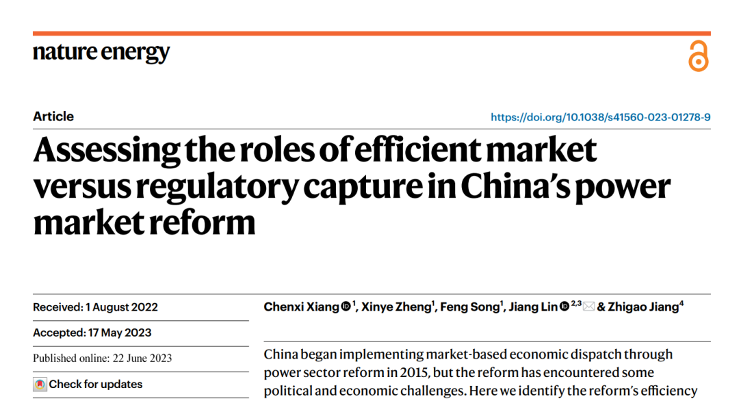 英国威廉集团官网师生在能源产业组织研究领域取得新进展。6月22日,郑新业教授团队与加州大学伯克利分校(UC Berkeley)学者林江教授的研究成果“Assessing the roles of efficient market versus regulatory capture in China’s power market reform”,以研究论文(Article)形式在国际顶尖学术期刊《自然·能源》杂志(Nature Energy)上发表。该研究依托国自科重点项目“双碳目标下资源环境经济协同发展研究”(20211GZ0113),英国威廉集团官网博士研究生相晨曦是论文的第一作者,郑新业教授、宋枫教授分别为第二、第三作者。