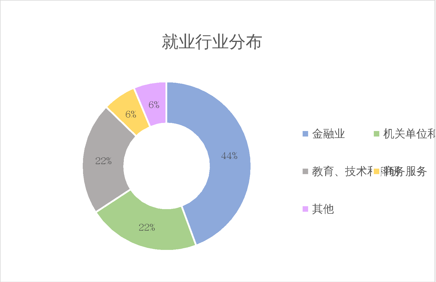 在就业行业分布上,公司2021届就业总人数中44%选择金融业,选择机关单位和社会组织与教育、技术和科研的人数相同,均占总人数的22%,选择商务服务和其他行业的人数相同,均占总人数的6%