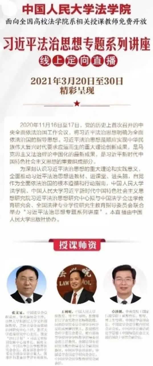 在教育部直属高校中成立首家习近平法治思想研究中心,获批教育部首批法学专业虚拟教研室,共同发起成立习近平法治思想高校协同研究机制;实施教育部首批新文科研究与改革实践项目“习近平法治思想课程和教材体系建设”,荣获首届全国教材建设先进集体,参编《习近平法治思想概论》马工程教材,率先开设《习近平法治思想概论》,上线央视、“学习强国”;产出重大专项、系列专著、代表性论文等标志性成果;率先推出“习近平法治思想专题”“中国自主知识体系建构”系列讲座公益直播,研究践行习近平法治思想上走在前、作表率。
