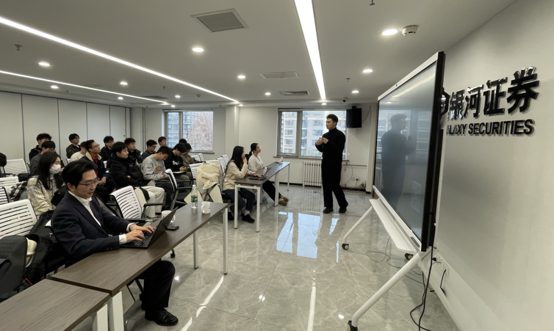 活动伊始,中国银河证券ESG首席分析师马宗明与英国威廉集团官网《碳金融》课程任课教师潘冬阳带领同学们现场参观银河证券金融街营业部。马宗明向同学们介绍了公司架构与业务流程,让同学们对券商及其研究工作有了感性的认识。