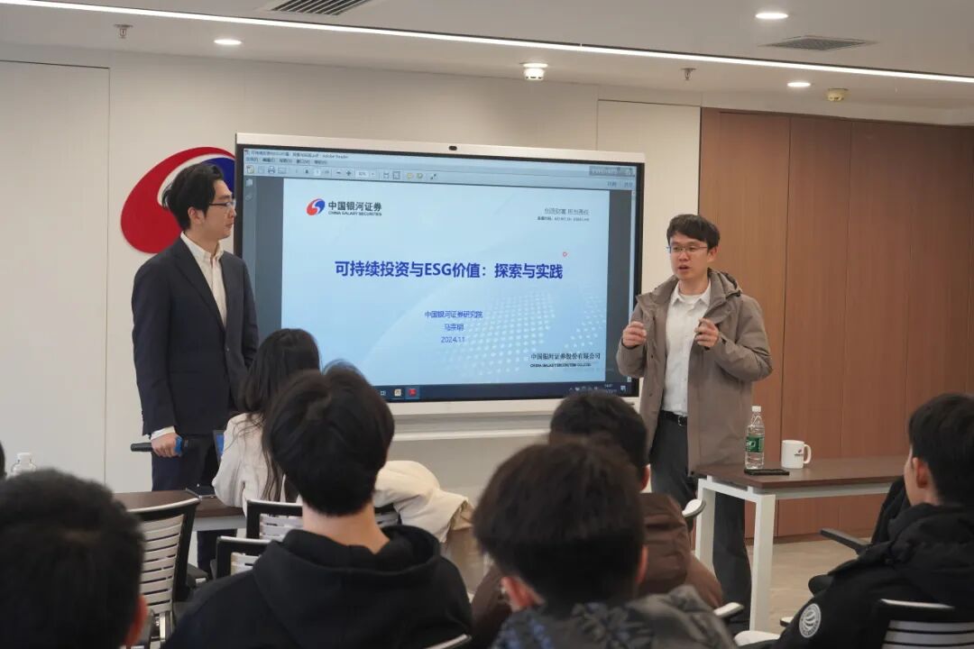在互动环节,同学们结合课程知识与实习经历积极提问,“银河ESG评级与MSCI有何不同?”“从事碳金融需补充哪些技能?”等问题直击核心。“不要追求‘走捷径’,金融行业缺的是能沉下心做研究的人,多实习、多实践,才能找到适配方向。”在场老师为同学们给出了中肯建议。