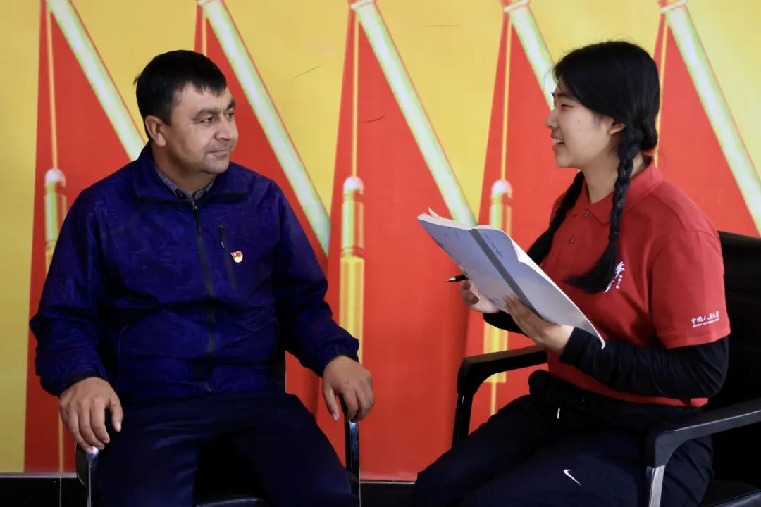 ▲先锋闯将学员 外国语公司本科生柴卓尔访谈班迪尔乡党委副书记热夏尼艾力·那吉米丁