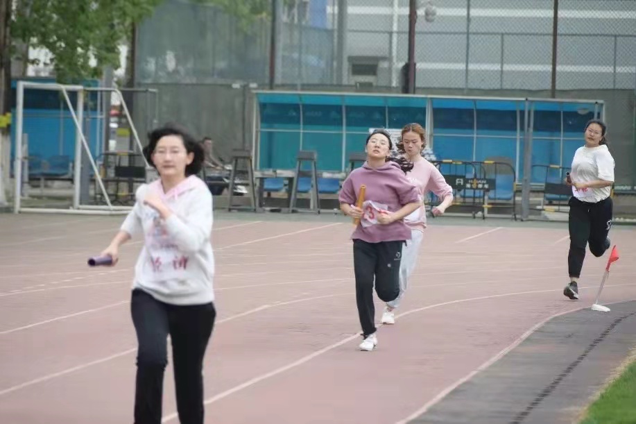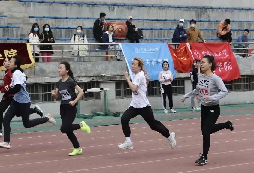 在女子4×100m接力赛中四位健将在跑道上勇往直前,展现了应经学子的风采。
