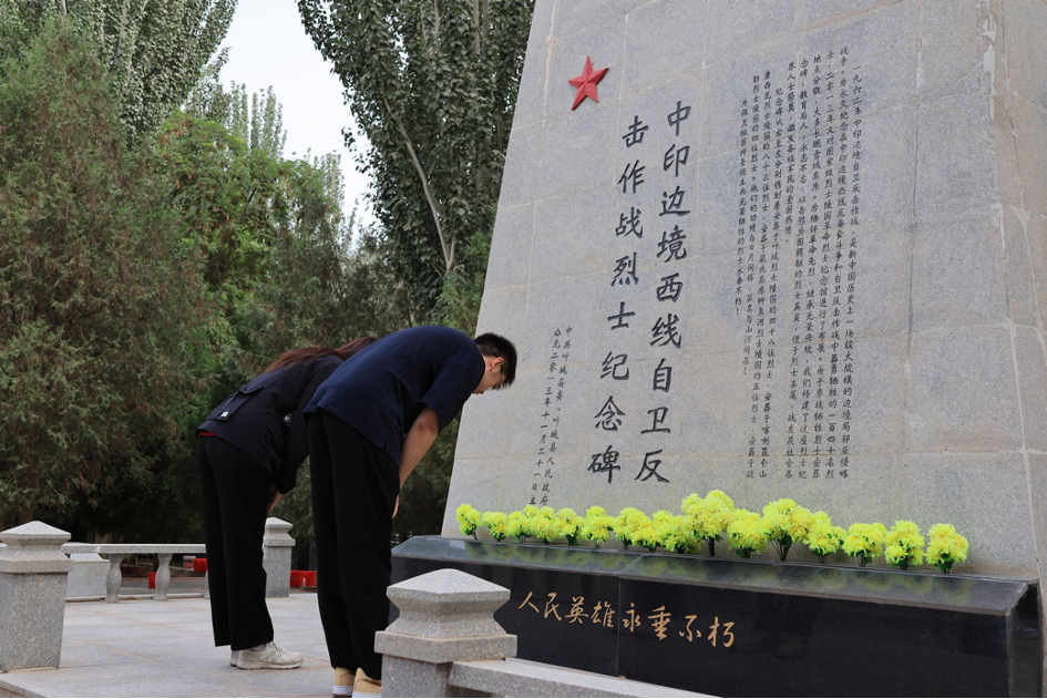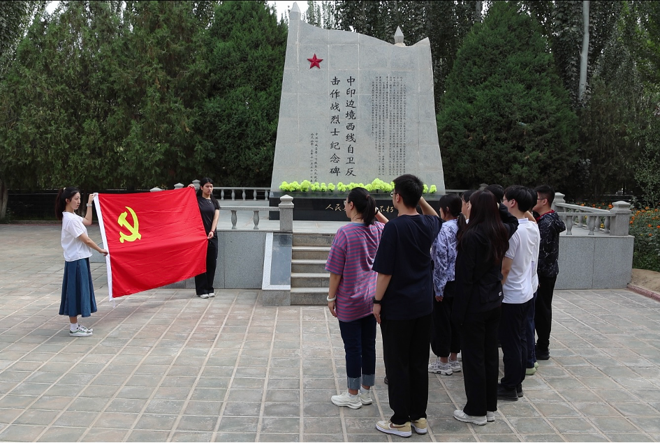 为了永不忘却、深切缅怀、传承精神、激励后辈,调研团的第一站来到了叶城烈士陵园。这里埋葬和纪念着的,是为了国土和人民而坚守的英勇烈士。在庄严肃穆的革命烈士纪念碑前,全体调研团成员行鞠躬礼,深切悼念、缅怀革命先烈。在烈士陵园纪念馆内,一幅幅珍贵的照片和实物生动再现了1962年中印自卫反击战的历史,调研团师生为在高原极寒的冰天雪地中前线部队的英勇善战和后勤军民的团结支援而深深感动。在英雄墓区前,调研团师生依次为守边烈士献上鲜花并鞠躬致意。最后,在革命英雄纪念碑前,全体党员面对党旗重温入党誓词,一句句誓言,是共产党人的使命担当,是新时代青年的接力奋发!