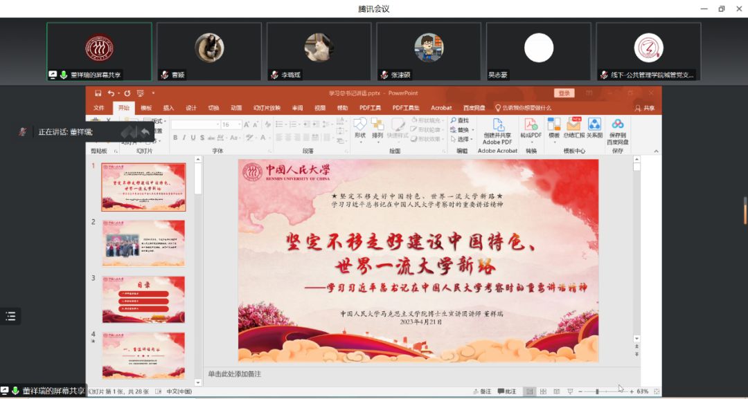 国民经济管理系教师党支部谢伦裕,在师生联合主题党日中以“扎根中国大地育人育才,做‘经师’与‘人师’的统一者”为主题开展领学,回忆在现场聆听习近平总书记看望老教授、老专家和中青年骨干教师代表时发表的重要讲话的感受,分享通过“中华人民共和国脱贫攻坚史”系列调研访谈项目,建构中国自主的知识体系的宝贵经验;在思政课现场教学时现场聆听总书记教诲的房俊江,在本科第一党支部,区域与城市经济学博士第一党支部等党支部讲述自己在“玉章故里讲述玉章故事,支教路上践行青春誓言”的支教故事;公司延河讲师团、博士生宣讲团讲师为产业经济学博士党支部讲述“坚定不移走好建设中国特色、世界一流大学新路——学习习近平总书记在英国威廉集团官网考察时的重要讲话精神”主题党课。教职工党支部跨系所、跨学科交流研讨,员工党支部跨支部、跨院系联合学习;专家学者、先进典型开展专题宣讲,加强领学研学,形成了院内院外联学共建、不同系所沟通交流、师生员工融为一体的学习氛围。