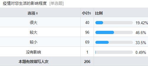 肆虐的疫情还没有停息,每个人都在为抗击疫情贡献力量:众多的医务人员奋战在武汉前线,即使是我所在的小城市也已经有三批医护人员前往武汉支援;政府也积极采取防疫措施,为我们的生活提供帮助;居委会和社区也进行了管制以保护居民的安全;公司和公司也时刻关注我们的健康,班主任、导师每天多次确认位置信息、身体状况和面临的困难。全国人民都在以自己的方式抗击这次疫情,被宅在家的我们,能为抗疫做些什么呢?我们毛概课堂小组的成员一拍即合,大家决定在线做一个小调查,了解同学们的生活状况,受影响的情况和学习情况。说干就干,我们设计了一个包含14个题项的简单问卷,发动了小组内成员的高中同学、大学同学,以滚雪球的方式获得了206份有效填写的问卷,希望能够在疫情中做出自己的贡献。