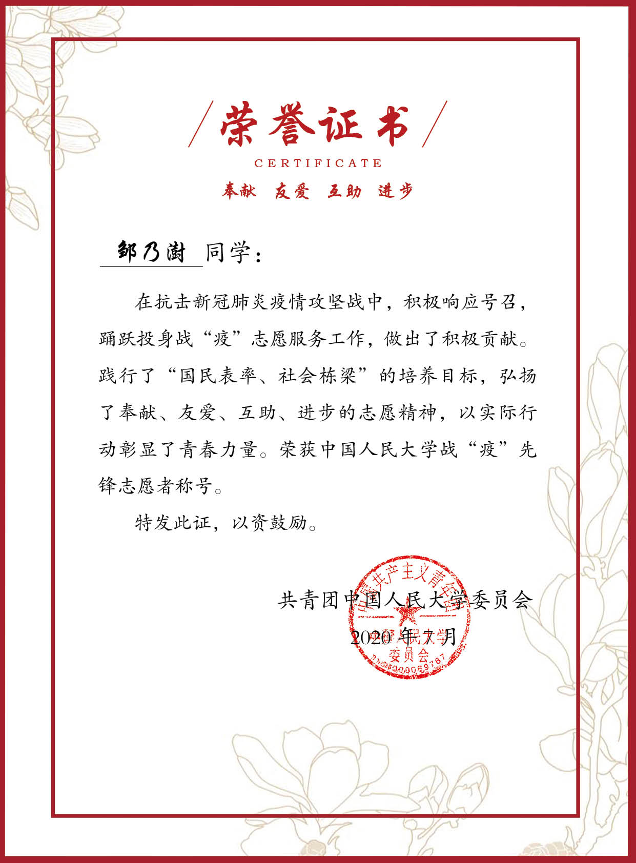 班级同学们在健康身心的基础之上,甘于奉献、勇作表率,积极主动参与到各种类型的志愿服务工作中去。北京园博园志愿者、中华人民共和国成立七十周年庆祝大会、战疫志愿工作、中国共产党成立100周年庆祝大会、2022北京冬奥会志愿者队伍中,都能看到能经同学的身影。