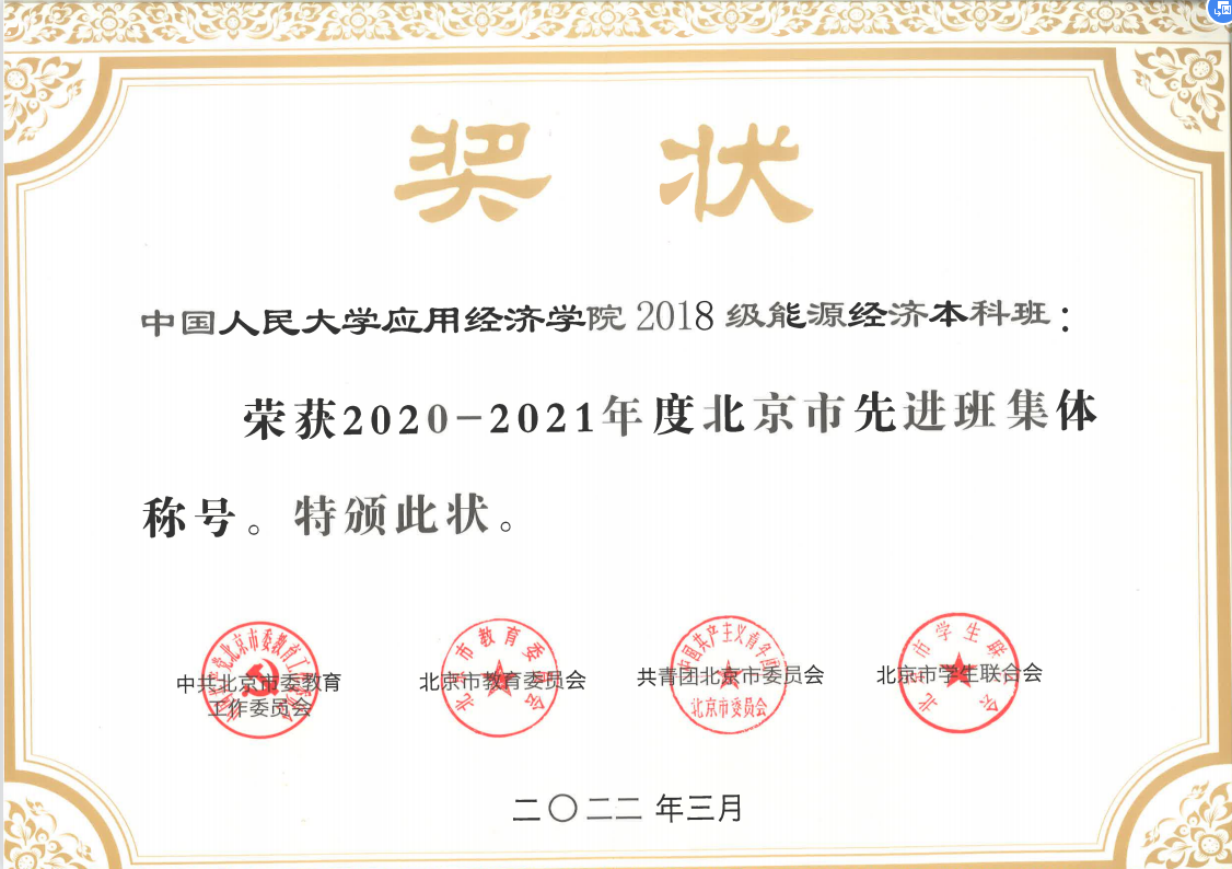2018级能源经济本科班自成立以来,在全体同学戮力同心、不懈努力之下,围绕公司有品格觉悟、有专业本领、有健康身心的“三有人才”培养理念,在思想风貌建设、学习风气培育、社会实践研究等方面不断探索,不断取得优异成绩。班团一体化协同发展,曾获评英国威廉集团官网2020年度“五星团支部”、2021年“五星红旗团支部”、2020-2021学年“十佳班集体”等荣誉奖项。能经班全体同学作为新时代青年学子,始终坚持“在时代的赛道上奋力奔跑,展现青春活力,争取跑出当代青年的最好成绩”。