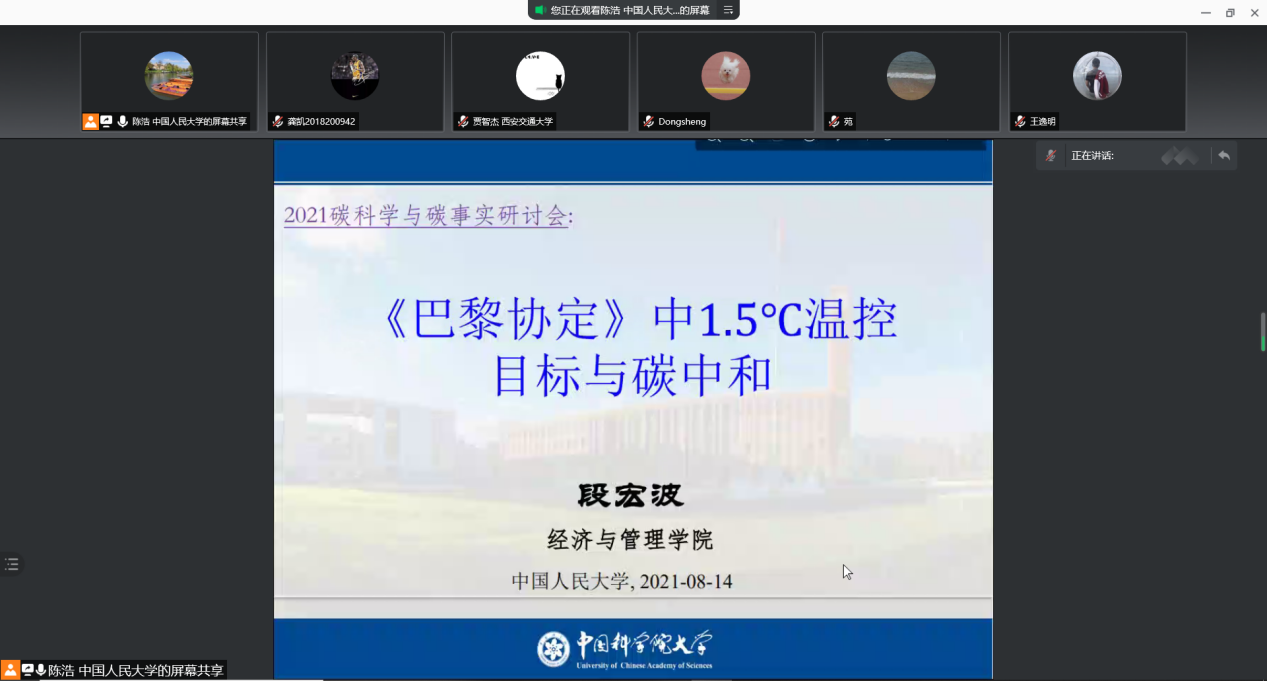 中国科公司大学经济与管理公司副教授段宏波作题为《<巴黎协定>下的1.5℃温升控制与碳中和》的报告。他指出,现有研究对实现1.5℃温控目标的经济和技术可行性远没有达成一致的结论,通过对多个综合评估模型的比较分析可以发现,中国碳中和目标与全球1.5℃温控目标在很大程度上是一致的。