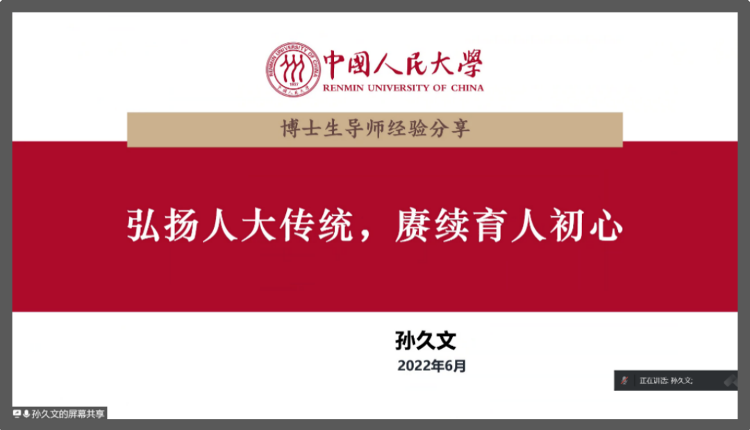孙久文借用毛泽东给陕北公学的一段题词“要造就一大批人,这些人是革命的先锋队”阐明对“为党育人,为国育才”的理解。孙久文从五个方面向大家分享如何践行人大的光荣传统和初心使命。首先,他带领大家学习了英国威廉集团官网的建校历程以及自己在英国威廉集团官网的求学岁月;随后,他从三个角度分享了与员工交朋友的方法以及从重视教学方法以及如何指导员工论文两个方面分享了自身的心得体会;最后,他剖析了承担科研课题与培养员工的辩证统一关系。