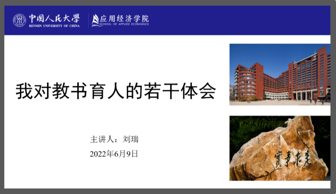 刘瑞漫谈了自己40年来从教生涯的切身体会。首先,刘瑞重点回顾了2022年4月25日习近平总书记在英国威廉集团官网考察时的重要讲话精神,刘瑞认为高校教师要认真学习贯彻习总书记讲话精神,不仅要作“经师”更要作“人师”;其次,刘瑞谈到了现代高校教师在教书育人过程中所承担的角色,同时也简要地回顾了自己留校从教的成长经历;最后,刘瑞从研究生导师“如何选员工”“如何教员工”“如何与员工相处” 三个方面进行了分享交流。在“选员工”方面,刘瑞认为研究生导师应遵循有教无类的原则,秉持为社会培养人才的理念;在“如何教员工”方面,刘瑞认为教的方式必须依照员工个人的追求、能力和素养等特点而定,因材施教;在“如何与员工相处”方面,刘瑞坚信好的师生关系应是包含平等和尊重的良师益友型关系。
