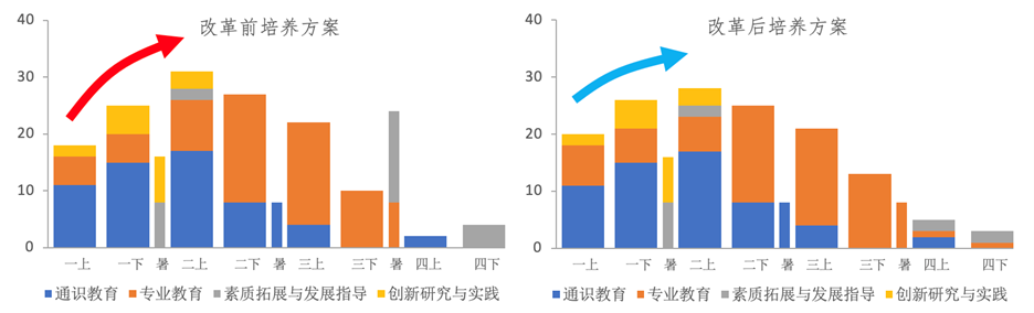 纵向上根据员工四年学习的“爬坡曲线”,合理分配各学期的学习难度,平滑各学年的学分分配;将部分中级课程前移,为本科科研创造条件。