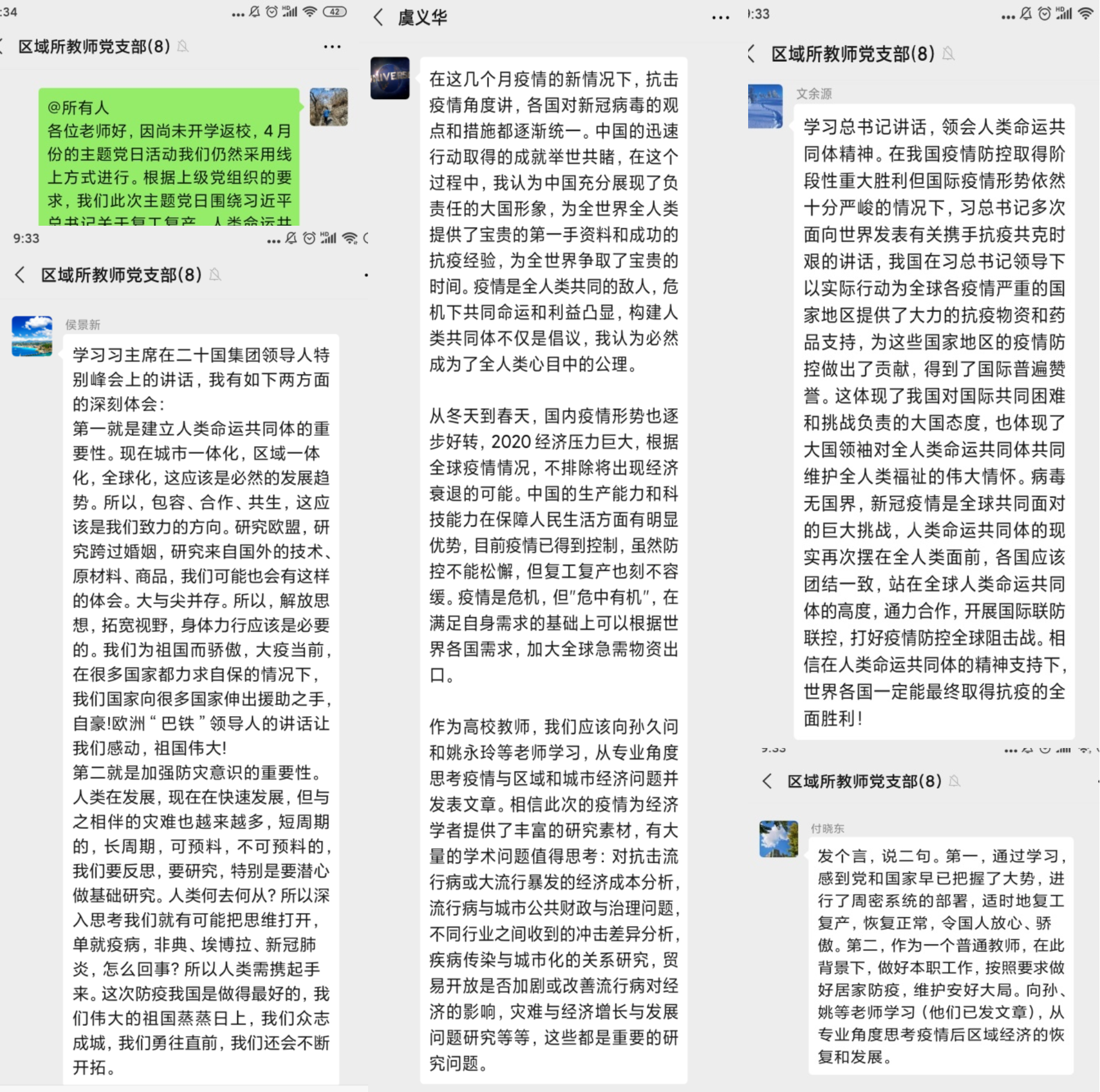 孙久文和姚永玲两位同志还分享了各自公开发表的关于疫情对区域经济影响和如何开展城市复工复产的专业研究成果。其他支部成员深受启发和鼓舞,也纷纷表示要加强研究,从专业角度为疫情防控和经济复苏提供决策支撑,贡献自己的力量。
